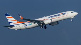 Pronajatý letoun od bulharských European Air Charter s hybridními polepy Condoru při odletu večerního charterového letu DE1596 na Corfu během posledních paprsků zapadajícího Slunce.