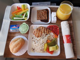 Na dálkových linkách KLM z Amsterdamu si cestující může za příplatek zvolit hlavní jídlo z "a la Carte" menu. Toho jsem využil na lince do Limy a zvolil jsem Captain´s Choice, což kromě krásného balení v černých krabičkách s imitací kůže bylo i velmi dobré a lepší než klasicky nabízené "Chicken or pasta". Jednalo se o mini řezy s rybou a chřestem a hovězí s bramborem.
